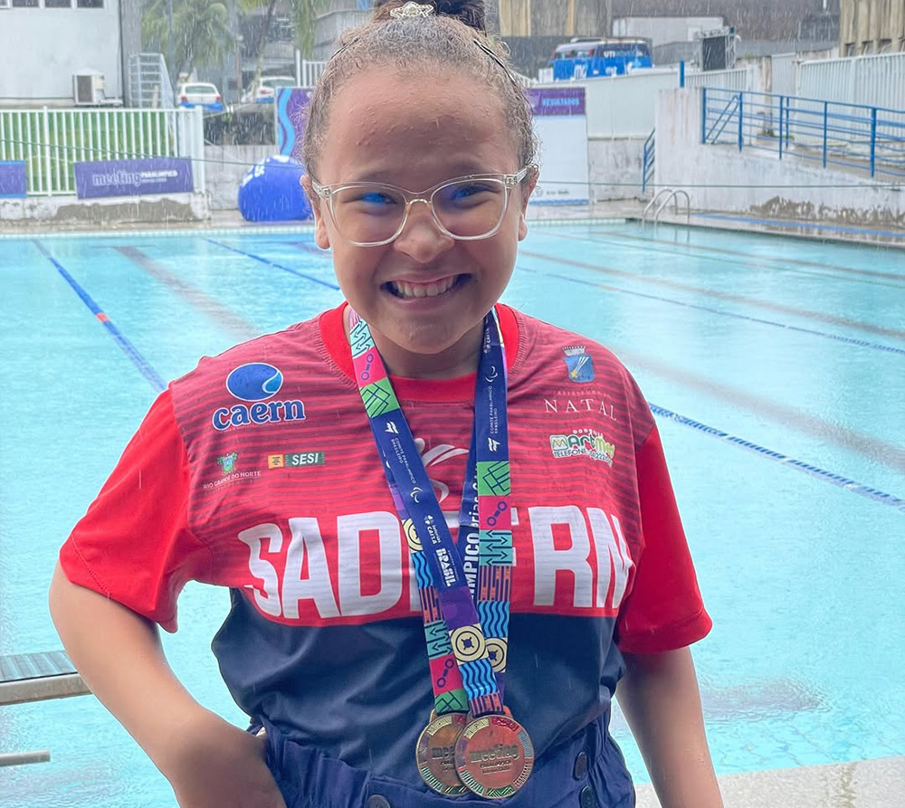 Aluna da Escola Cívico-Militar Municipal Yayá Paiva, que competiu pela SADEF-RN (Sociedade Amigos do Deficiente Físico do Rio Grande do Norte), Vitória venceu as provas dos 50 e 100 metros livres na classe S6.