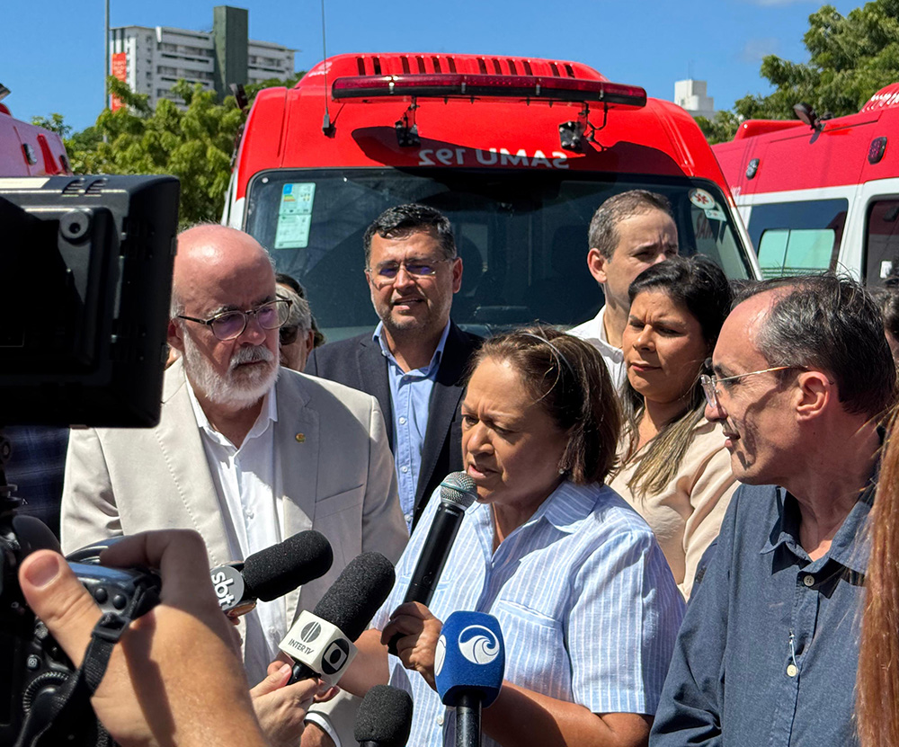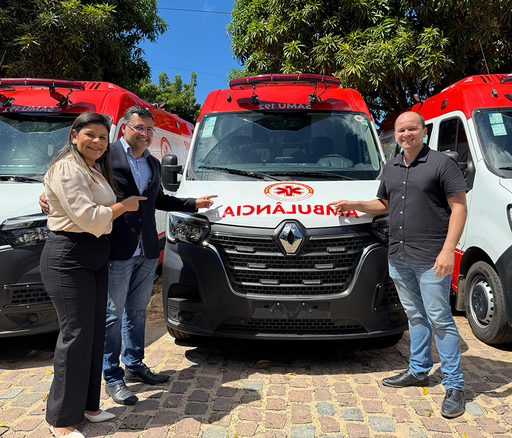 O prefeito Gustavo Santos recebeu as chaves do veículo das mãos da governadora Fátima Bezerra. Ao lado dele, estavam a vice-prefeita Valeria Mesquita e o secretário municipal de saúde Júnior Moreira.