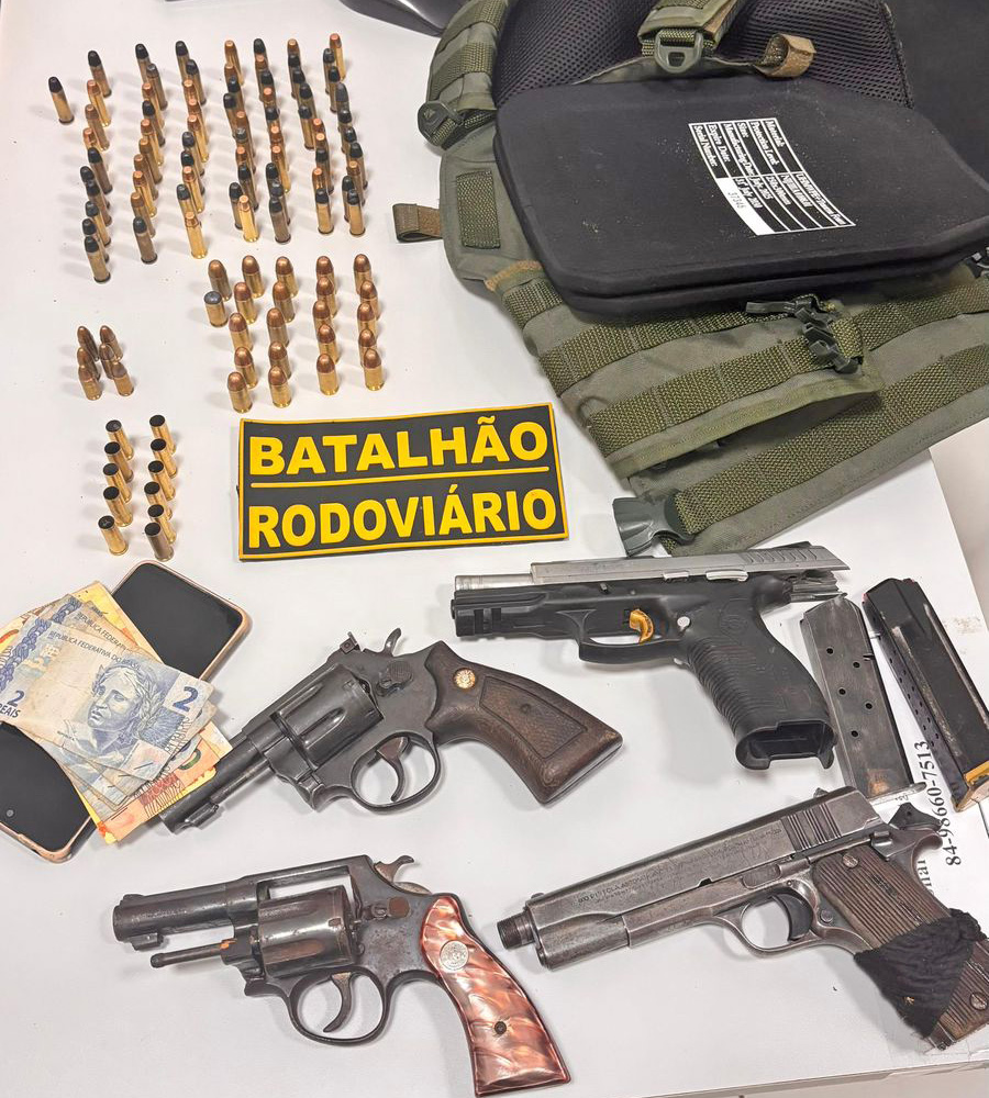 Segundo o CPRE, durante blitz realizada na RN 063, os policiais decidiram abordar e fazer uma busca veicular em um automóvel, onde foram localizadas 4 armas de fogo (sendo duas pistolas e dois revólveres), 1 colete balístico e 102 munições.