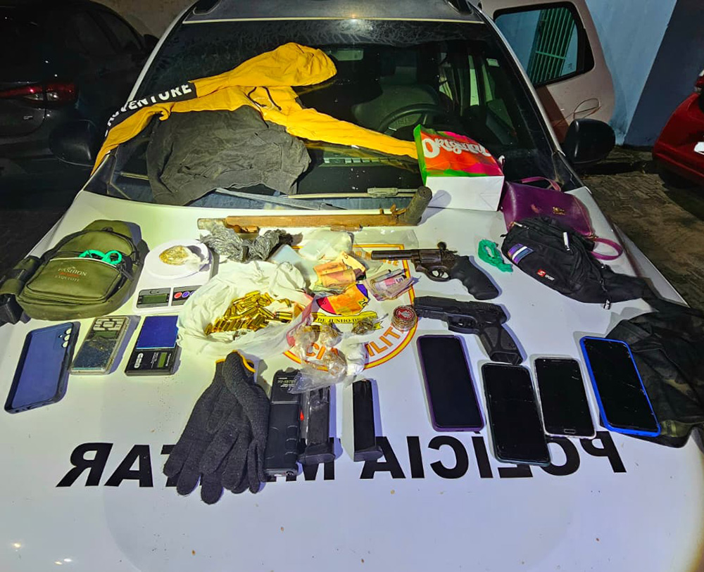 Os policiais também conseguiram apreender 1 pistola calibre 9mm, 1 revólver calibre 38, 1 espingarda calibre 12 (fabricação caseira), munições de vários calibres; 48 porções pequenas de crack; aparelhos celulares, entre outros objetos.