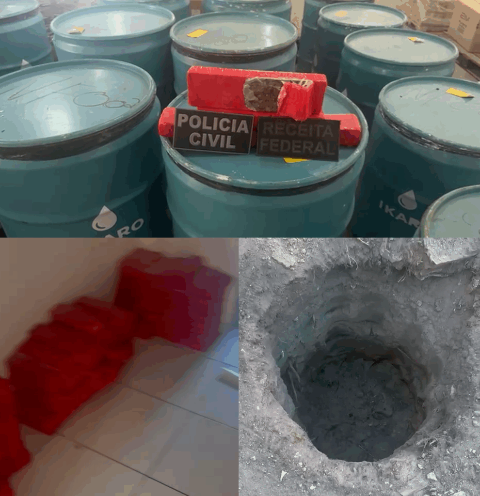 À tarde, outros cerca de 500 quilos do entorpecente foram localizados em uma residência no bairro Vale do Sol. A droga estava prestes a ser enterrada – havia buracos abertos no terreno e alguns tambores já posicionados.