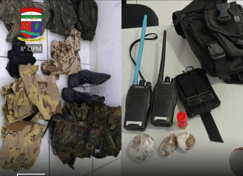 Durante as diligências pela região, um homem foi preso e foram apreendidos fardamentos camuflados, coturno, munição cal.12, porções de drogas análogas à maconha, rádios transmissores, bornal e porta carregador.