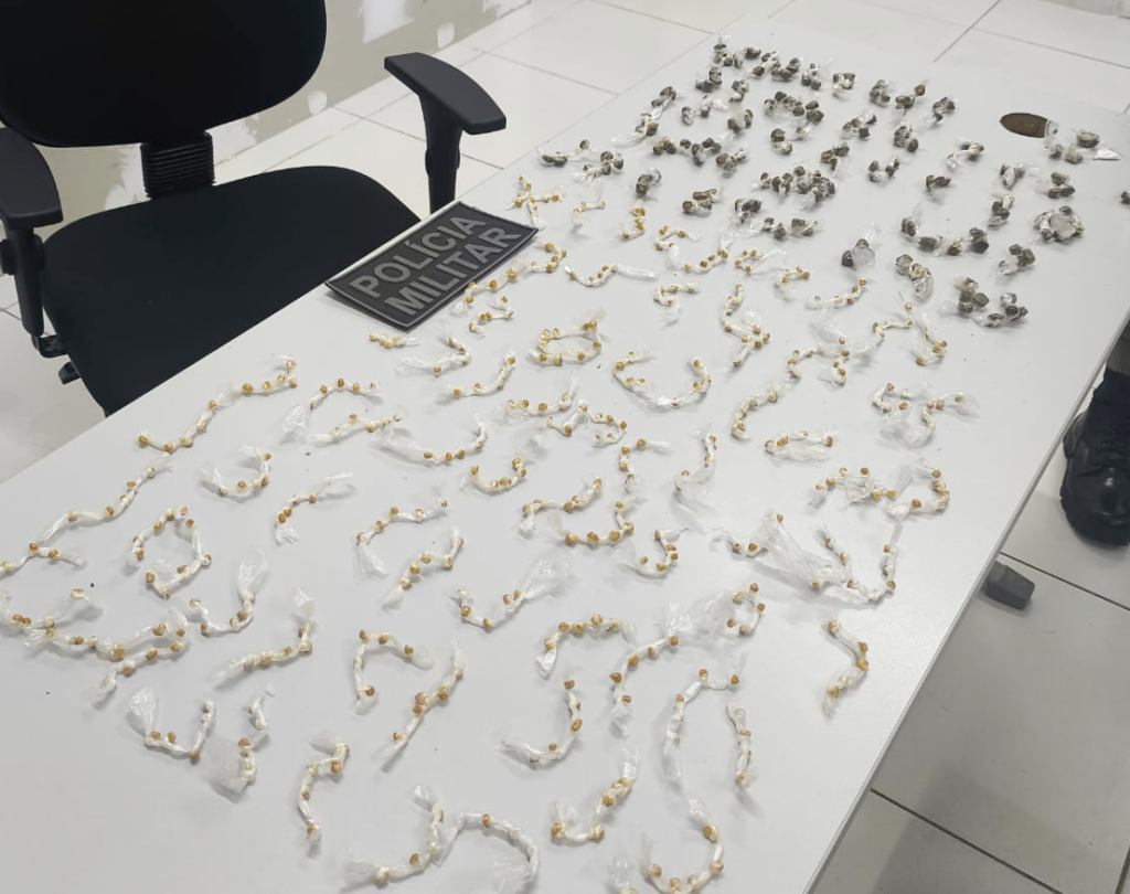 Na abordagem inicial, foram encontradas porções de drogas em posse do indivíduo. Dando continuidade à ocorrência, foi localizada uma quantidade maior de entorpecentes já embalados para venda, bem como munições de arma de fogo calibre .38 e dinheiro em espécie
